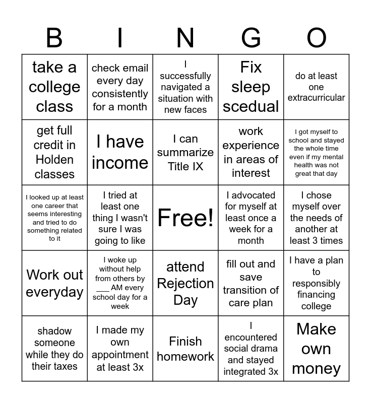 This bingo card has a free space and 24 words: I woke up without help from others by ___ AM every school day for a week, I made my own appointment at least 3x, I can summarize Title IX, shadow someone while they do their taxes, do at least one extracurricular, take a college class, get full credit in Holden classes, check email every day consistently for a month, I advocated for myself at least once a week for a month, attend Rejection Day, work experience in areas of interest, I looked up at least one career that seems interesting and tried to do something related to it, fill out and save transition of care plan, I have a plan to responsibly financing college, I have income, I encountered social drama and stayed integrated 3x, I chose myself over the needs of another at least 3 times, I successfully navigated a situation with new faces, I got myself to school and stayed the whole time even if my mental health was not great that day, I tried at least one thing I wasn't sure I was going to like, Make own money, Work out everyday, Fix sleep scedual and Finish homework.