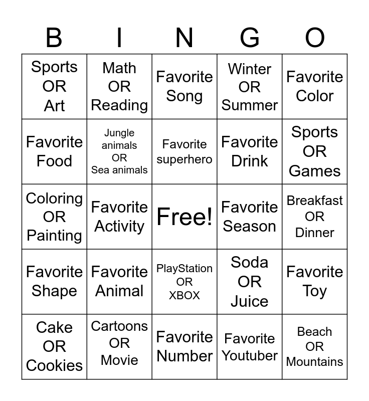This bingo card has a free space and 24 words: Favorite Animal, Cartoons OR Movie, Favorite superhero, Cake OR Cookies, Favorite Color, Sports OR Art, Favorite Food, Math OR Reading, Favorite Season, PlayStation OR XBOX, Favorite Drink, Coloring OR Painting, Soda OR Juice, Favorite Toy, Jungle animals OR Sea animals, Favorite Youtuber, Breakfast OR Dinner, Favorite Song, Sports OR Games, Favorite Activity, Beach OR Mountains, Favorite Shape, Winter OR Summer and Favorite Number.