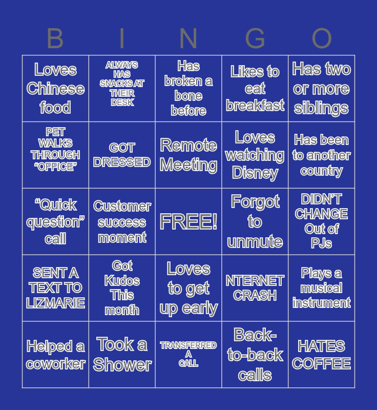 This bingo card has a free space and 24 words: Got Kudos This month, Took a Shower, Remote Meeting, Helped a coworker, Has two or more siblings, Loves Chinese food, PET WALKS THROUGH “OFFICE”, ALWAYS HAS SNACKS AT THEIR DESK, Forgot to unmute, Loves to get up early, Loves watching Disney, “Quick question” call, NTERNET CRASH, Plays a musical instrument, GOT DRESSED, Back-to-back calls, DIDN’T CHANGE Out of PJs, Has broken a bone before, Has been to another country, Customer success moment, HATES COFFEE, SENT A TEXT TO LIZMARIE, Likes to eat breakfast and TRANSFERRED A CALL.