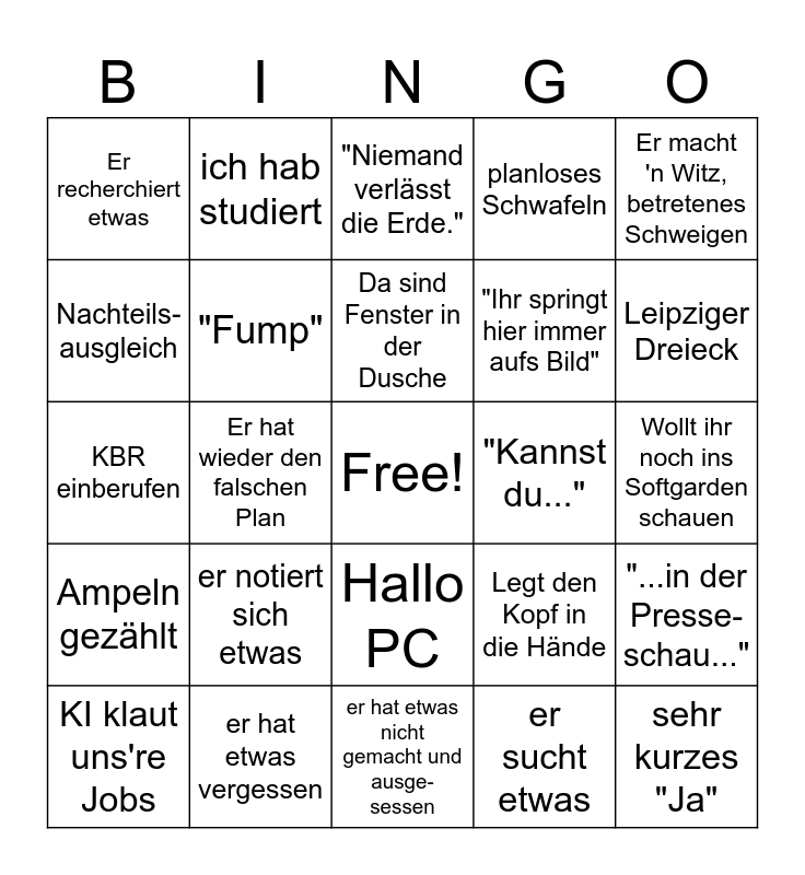This bingo card has a free space and 28 words: "...in der Presse- schau...", Es gibt ein Layer 8 Problem, "Ihr springt hier immer aufs Bild", er sucht etwas, Nachteils- ausgleich, "Niemand verlässt die Erde.", ich hab studiert, Ampeln gezählt, "Kannst du...", KI klaut uns're Jobs, KBR einberufen, planloses Schwafeln, er hat etwas vergessen, er hat etwas nicht gemacht und ausge- sessen, Leipziger Dreieck, Biopause, er notiert sich etwas, "Fump", Da sind Fenster in der Dusche, Hallo PC, Er recherchiert etwas, Er fasst etwas zusammen, was eben gesagt wurde, sehr kurzes "Ja", Er hat wieder den falschen Plan, Wollt ihr noch ins Softgarden schauen, Legt den Kopf in die Hände, Er macht 'n Witz, betretenes Schweigen and Sitzung wird überzogen.