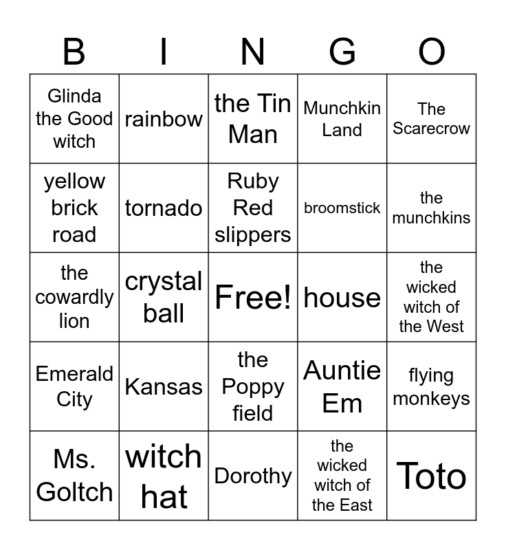 This bingo card has a free space and 24 words: Ms. Goltch, Kansas, Ruby Red slippers, the wicked witch of the East, The Scarecrow, Glinda the Good witch, rainbow, the Tin Man, house, the wicked witch of the West, the cowardly lion, tornado, Auntie Em, flying monkeys, yellow brick road, witch hat, Dorothy, Munchkin Land, the munchkins, Emerald City, crystal ball, the Poppy field, broomstick and Toto.