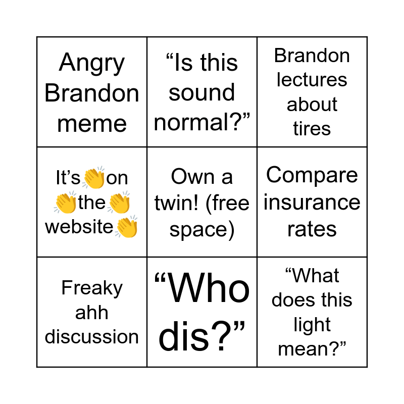 This bingo card has a free space and 8 words: Compare insurance rates, Brandon lectures about tires, “Is this sound normal?”, Freaky ahh discussion, Angry Brandon meme, “What does this light mean?”, It’s👏on👏the👏website👏 and “Who dis?”.