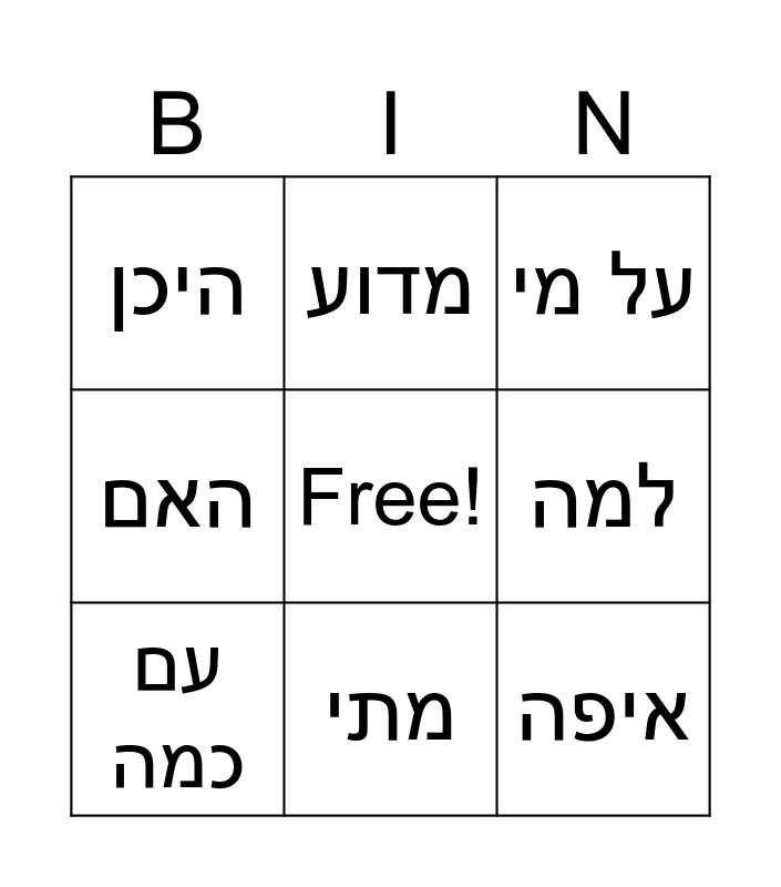 This bingo card has a free space and 23 words: מי, מה, מתי, מאין, איפה, היכן, למה, מדוע, כמה, איך, כיצד, איזה, איזו, אילו, לאן, את מי, על מי, על מה, עם כמה, ממה, האם, על איזה and במה.