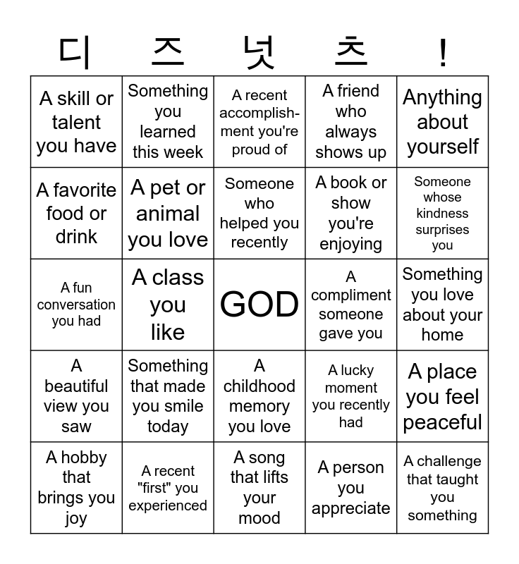 This bingo card has a free space and 24 words: Something that made you smile today, A recent "first" you experienced, Someone who helped you recently, A hobby that brings you joy, Anything about yourself, A skill or talent you have, A favorite food or drink, Something you learned this week, A compliment someone gave you, A childhood memory you love, A book or show you're enjoying, A fun conversation you had, A lucky moment you recently had, A place you feel peaceful, A pet or animal you love, A person you appreciate, Something you love about your home, A recent accomplish- ment you're proud of, Someone whose kindness surprises you, A class you like, A challenge that taught you something, A beautiful view you saw, A friend who always shows up and A song that lifts your mood.