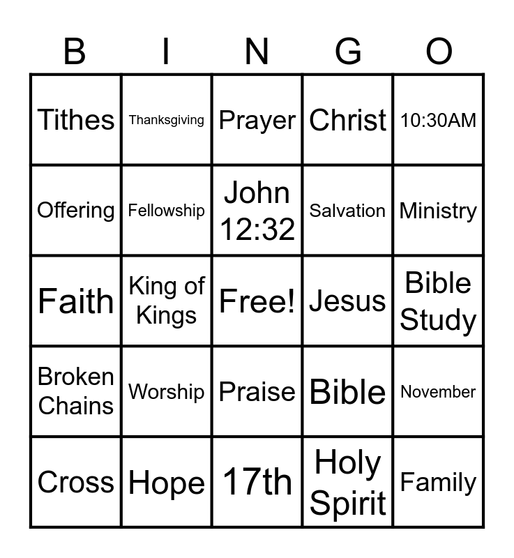 This bingo card has a free space and 25 words: Worship, 17th, John 12:32, Cross, 10:30AM, Tithes, Offering, Thanksgiving, Jesus, Praise, Salvation, Faith, Bible, November, Fellowship, Community, Bible Study, Prayer, Ministry, King of Kings, Family, Hope, Broken Chains, Christ and Holy Spirit.
