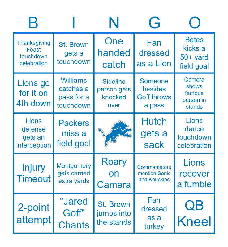 This bingo card has a free space and 24 words: Montgomery gets carried extra yards, "Jared Goff" Chants, Sideline person gets knocked over, 2-point attempt, Bates kicks a 50+ yard field goal, Thanksgiving Feast touchdown celebration, Lions go for it on 4th down, St. Brown gets a touchdown, Hutch gets a sack, Roary on Camera, Someone besides Goff throws a pass, Lions defense gets an interception, Commentators mention Sonic and Knuckles, Lions recover a fumble, Williams catches a pass for a touchdown, Fan dressed as a turkey, Lions dance touchdown celebration, One handed catch, Camera shows famous person in stands, Packers miss a field goal, QB Kneel, Injury Timeout, Fan dressed as a Lion and St. Brown jumps into the stands.