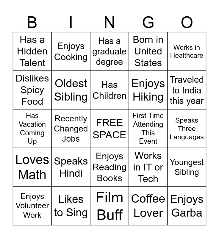 This bingo card has a free space and 24 words: Speaks Hindi, Likes to Sing, Has Children, Enjoys Volunteer Work, Works in Healthcare, Has a Hidden Talent, Dislikes Spicy Food, Enjoys Cooking, First Time Attending This Event, Enjoys Reading Books, Enjoys Hiking, Has Vacation Coming Up, Works in IT or Tech, Youngest Sibling, Oldest Sibling, Coffee Lover, Speaks Three Languages, Has a graduate degree, Traveled to India this year, Recently Changed Jobs, Enjoys Garba, Loves Math, Born in United States and Film Buff.