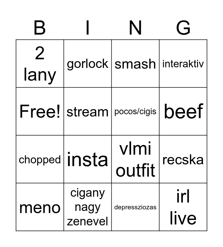 This bingo card has 16 words: cigany nagy zenevel, recska, smash, 2 lany, chopped, gorlock, vlmi outfit, depressziozas, Free!, stream, meno, interaktiv, insta, beef, pocos/cigis and irl live.