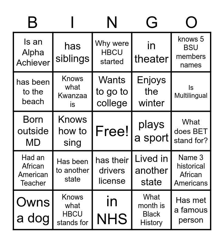 This bingo card has a free space and 24 words: Has been to another state, Knows what HBCU stands for, Wants to go to college, Owns a dog, knows 5 BSU members names, Is an Alpha Achiever, has been to the beach, has siblings, plays a sport, has their drivers license, Enjoys the winter, Born outside MD, Lived in another state, Name 3 historical African Americans, Knows what Kwanzaa is, What month is Black History, What does BET stand for?, Why were HBCU started, Is Multilingual, Knows how to sing, Has met a famous person, Had an African American Teacher, in theater and in NHS.