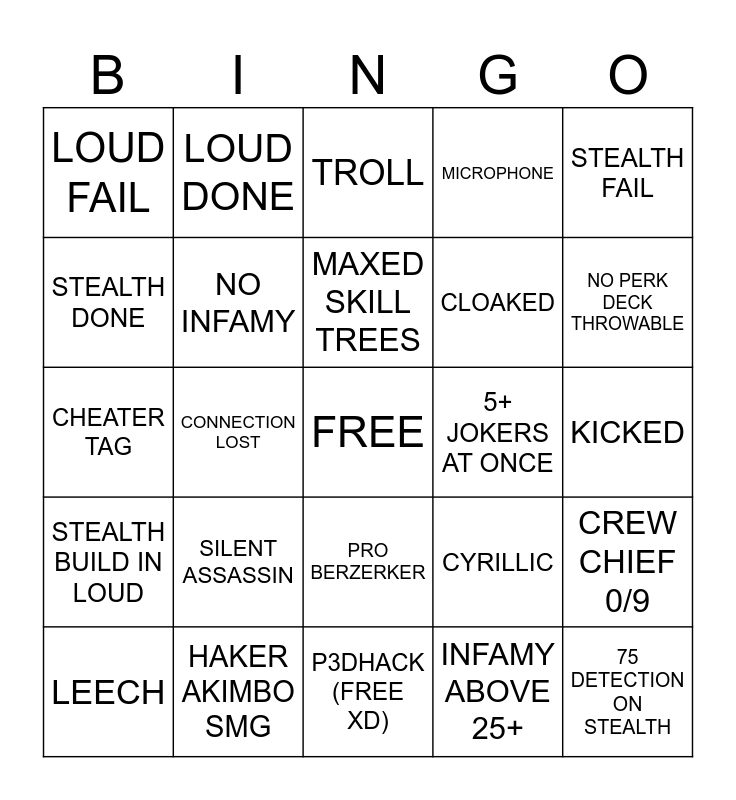 This bingo card has a free space and 24 words: SILENT ASSASSIN, HAKER AKIMBO SMG, MAXED SKILL TREES, LEECH, STEALTH FAIL, LOUD FAIL, STEALTH DONE, LOUD DONE, 5+ JOKERS AT ONCE, PRO BERZERKER, CLOAKED, CHEATER TAG, CYRILLIC, CREW CHIEF 0/9, NO INFAMY, INFAMY ABOVE 25+, KICKED, TROLL, NO PERK DECK THROWABLE, CONNECTION LOST, 75 DETECTION ON STEALTH, STEALTH BUILD IN LOUD, MICROPHONE and P3DHACK (FREE XD).