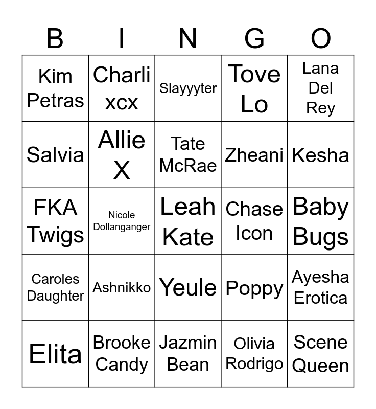 This bingo card has 25 words: Ashnikko, Jazmin Bean, Tate McRae, Elita, Lana Del Rey, Kim Petras, Salvia, Charli xcx, Chase Icon, Yeule, Zheani, FKA Twigs, Poppy, Ayesha Erotica, Allie X, Scene Queen, Baby Bugs, Slayyyter, Kesha, Nicole Dollanganger, Leah Kate, Brooke Candy, Caroles Daughter, Tove Lo and Olivia Rodrigo.