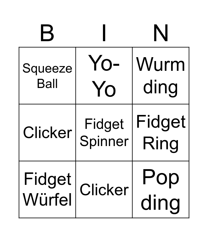 This bingo card has a free space and 9 words: Fidget Würfel, Wurm ding, Yo-Yo, Clicker, Squeeze Ball, Fidget Ring, Pop ding, Vyarrm Vyarrm and Clicker.
