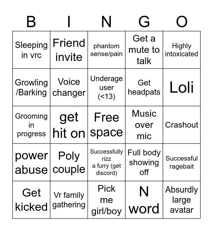This bingo card has a free space and 24 words: Get kicked, Poly couple, Underage user (<13), N word, Highly intoxicated, Sleeping in vrc, Friend invite, phantom sense/pain, Music over mic, Crashout, Grooming in progress, Voice changer, Full body showing off, Successful ragebait, Growling /Barking, Vr family gathering, Pick me girl/boy, Get a mute to talk, Loli, power abuse, get hit on, Successfully rizz a furry (get discord), Get headpats and Absurdly large avatar.