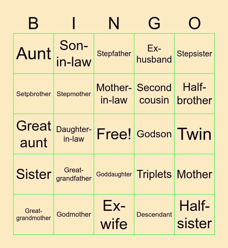 This bingo card has a free space and 24 words: Great-grandfather, Godmother, Mother-in-law, Great-grandmother, Stepsister, Aunt, Setpbrother, Son-in-law, Godson, Goddaughter, Second cousin, Great aunt, Triplets, Mother, Stepmother, Descendant, Twin, Stepfather, Half-brother, Daughter-in-law, Half-sister, Sister, Ex-husband and Ex-wife.