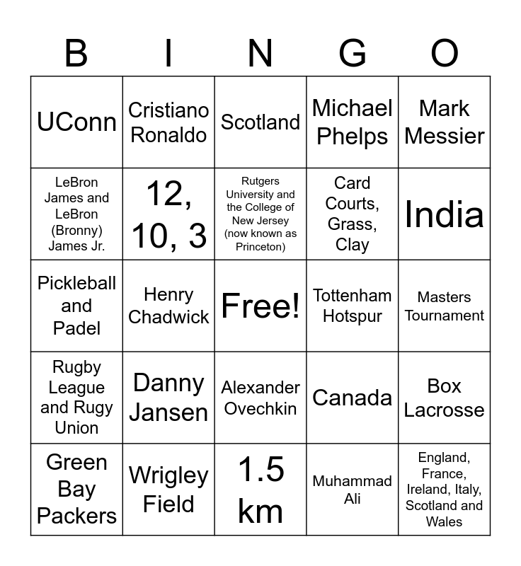 This bingo card has a free space and 24 words: Danny Jansen, Wrigley Field, Rutgers University and the College of New Jersey (now known as Princeton), Green Bay Packers, Mark Messier, UConn, LeBron James and LeBron (Bronny) James Jr., Cristiano Ronaldo, Tottenham Hotspur, Alexander Ovechkin, Card Courts, Grass, Clay, Pickleball and Padel, Canada, Box Lacrosse, 12, 10, 3, Muhammad Ali, Masters Tournament, Scotland, India, Henry Chadwick, England, France, Ireland, Italy, Scotland and Wales, Rugby League and Rugy Union, Michael Phelps and 1.5 km.