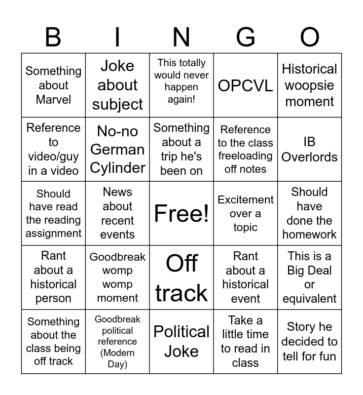This bingo card has a free space and 24 words: Goodbreak womp womp moment, Goodbreak political reference (Modern Day), Something about a trip he's been on, Something about the class being off track, Historical woopsie moment, Something about Marvel, Reference to video/guy in a video, Joke about subject, Excitement over a topic, Off track, Reference to the class freeloading off notes, Should have read the reading assignment, Rant about a historical event, This is a Big Deal or equivalent, No-no German Cylinder, Take a little time to read in class, Should have done the homework, This totally would never happen again!, IB Overlords, News about recent events, Story he decided to tell for fun, Rant about a historical person, OPCVL and Political Joke.