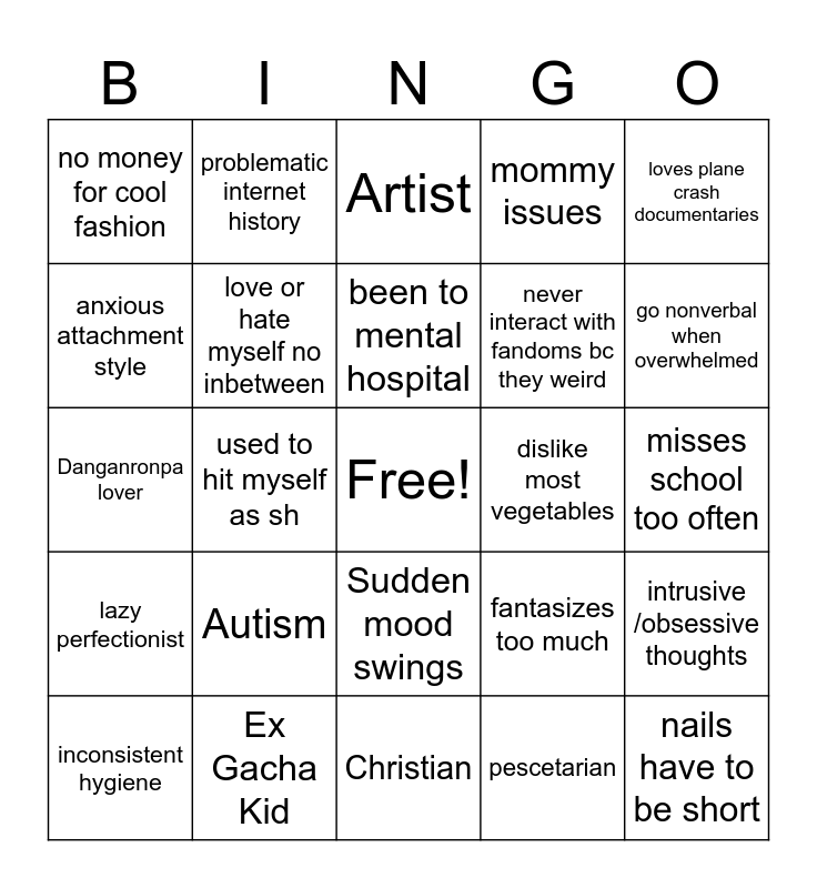This bingo card has a free space and 24 words: Autism, Ex Gacha Kid, been to mental hospital, inconsistent hygiene, loves plane crash documentaries, no money for cool fashion, anxious attachment style, problematic internet history, dislike most vegetables, Sudden mood swings, never interact with fandoms bc they weird, Danganronpa lover, fantasizes too much, intrusive /obsessive thoughts, love or hate myself no inbetween, pescetarian, misses school too often, Artist, go nonverbal when overwhelmed, used to hit myself as sh, nails have to be short, lazy perfectionist, mommy issues and Christian.