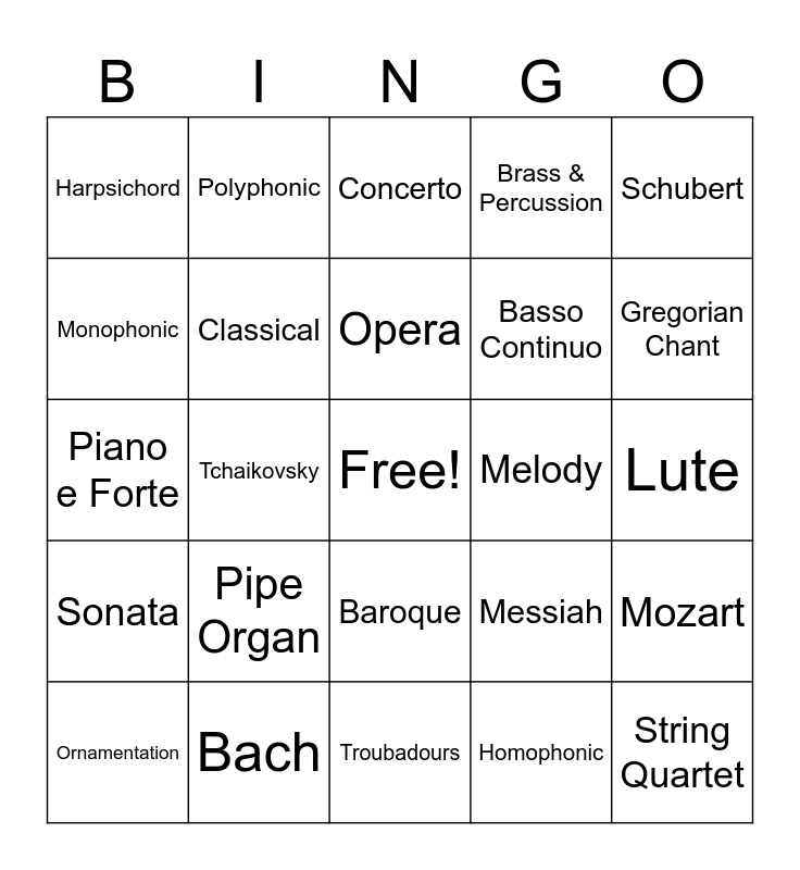 This bingo card has a free space and 24 words: Pipe Organ, Bach, Opera, Ornamentation, Schubert, Harpsichord, Monophonic, Polyphonic, Melody, Baroque, Basso Continuo, Piano e Forte, Messiah, Mozart, Classical, Homophonic, Lute, Concerto, Gregorian Chant, Tchaikovsky, String Quartet, Sonata, Brass & Percussion and Troubadours.