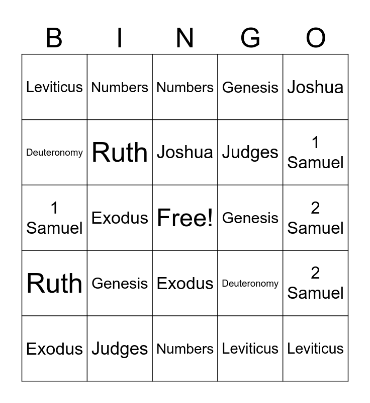 This bingo card has a free space and 24 words: Genesis, Judges, Joshua, Exodus, Joshua, Leviticus, Deuteronomy, Numbers, Genesis, Exodus, Judges, 1 Samuel, Deuteronomy, 2 Samuel, Ruth, Leviticus, 2 Samuel, Numbers, 1 Samuel, Exodus, Leviticus, Ruth, Genesis and Numbers.
