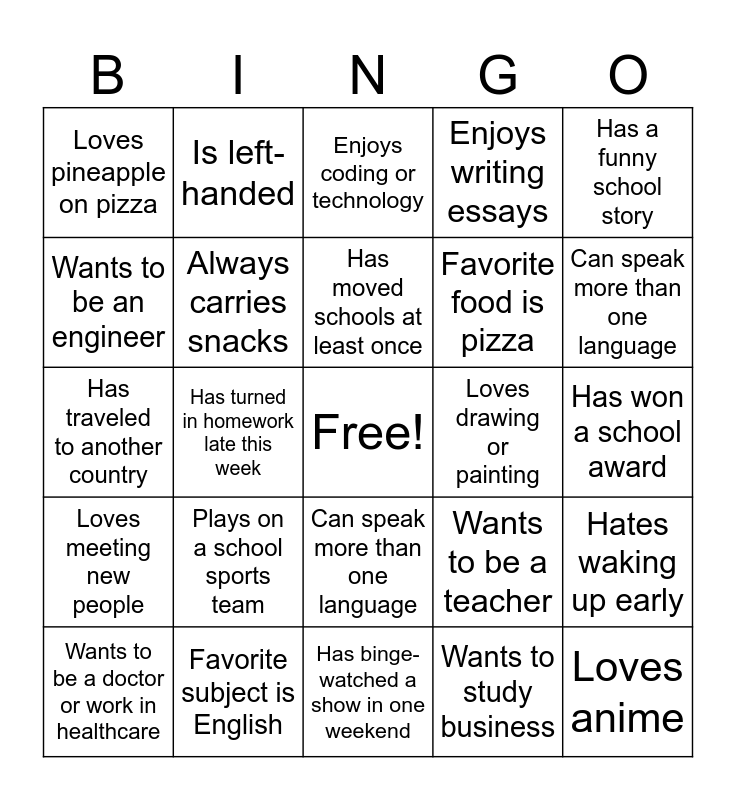This bingo card has a free space and 24 words: Plays on a school sports team, Favorite subject is English, Has moved schools at least once, Wants to be a doctor or work in healthcare, Has a funny school story, Loves pineapple on pizza, Wants to be an engineer, Is left-handed, Loves drawing or painting, Can speak more than one language, Favorite food is pizza, Has traveled to another country, Wants to be a teacher, Hates waking up early, Always carries snacks, Wants to study business, Has won a school award, Enjoys coding or technology, Can speak more than one language, Has turned in homework late this week, Loves anime, Loves meeting new people, Enjoys writing essays and Has binge-watched a show in one weekend.