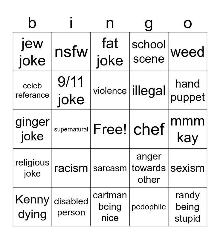 This bingo card has a free space and 24 words: Kenny dying, racism, violence, pedophile, weed, jew joke, nsfw, fat joke, chef, mmm kay, ginger joke, 9/11 joke, anger towards other, sexism, celeb referance, disabled person, cartman being nice, school scene, hand puppet, religious joke, supernatural, sarcasm, illegal and randy being stupid.