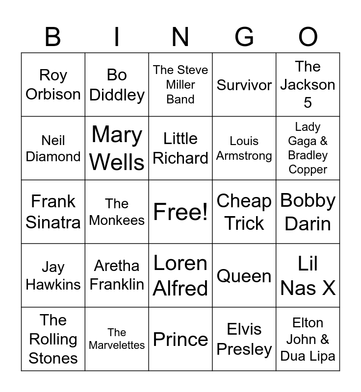 This bingo card has a free space and 24 words: Aretha Franklin, The Marvelettes, Little Richard, The Rolling Stones, The Jackson 5, Roy Orbison, Neil Diamond, Bo Diddley, Cheap Trick, Loren Alfred, Louis Armstrong, Frank Sinatra, Queen, Lil Nas X, Mary Wells, Elvis Presley, Bobby Darin, The Steve Miller Band, Lady Gaga & Bradley Copper, The Monkees, Elton John & Dua Lipa, Jay Hawkins, Survivor and Prince.