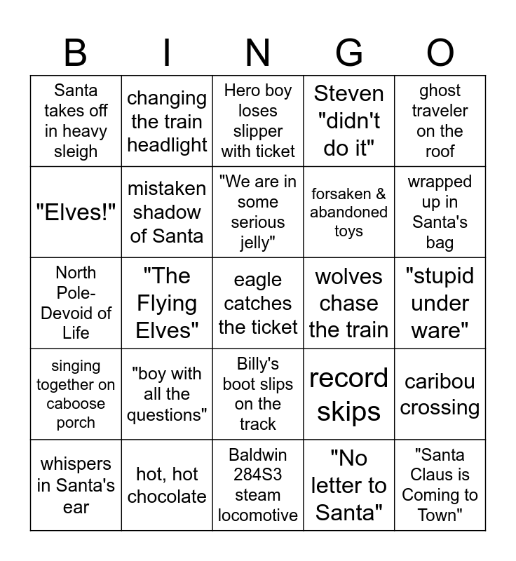 This bingo card has 49 words: Scrooge puppet, eagle catches the ticket, Billy's present, Baldwin 284S3 steam locomotive, "boy with all the questions", Glacier Gulch Roller Coaster, changing the train headlight, caboose on spinning turntable, "Elves!", "Rocking on Top of the World", mistaken shadow of Santa, Steven "didn't do it", caribou crossing, record skips, pocket watch- "schedule to keep", "taking the numatic", "We are in some serious jelly", wolves chase the train, follow the arrows, ghost traveler on the roof, "The Flying Elves", "No letter to Santa", Santa takes off in heavy sleigh, forsaken & abandoned toys, snowman waving goodbye, wrapped up in Santa's bag, whispers in Santa's ear, jumping into the coal, Billy's boot slips on the track, singing together on caboose porch, ripping of pocket- marbles spilling, Northern Lights, skiing on roof, "what matters is deciding to get on", hot, hot chocolate, Hero Boy Returns the sleigh bell, Ice on the tracks, reindeer lining up for sleigh, "stupid under ware", Hero Boy loses ticket, tv board of sleeping kids, hair pin saves the train, "Santa Claus is Coming to Town", "No greater gift than friendship", North Pole- Devoid of Life, Hero boy loses slipper with ticket, ticket punch B, rumbling of Hero Boy's house and pulling the emergency break.
