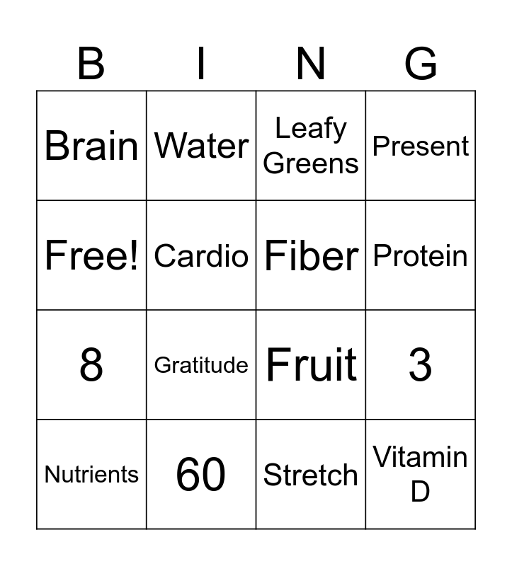 This bingo card has 16 words: 60, 3, Leafy Greens, Brain, 8, Water, Fruit, Stretch, Free!, Cardio, Nutrients, Present, Gratitude, Protein, Fiber and Vitamin D.