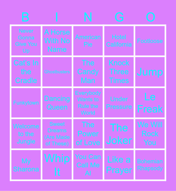 This bingo card has 75 words: ABC, Africa, American Pie, Another Brick In the Wall, Pt. 2, Back In Black, Bad, Bad, Bad Leroy Brown, Billie Jean, Blinded By the Light, Blitzkrieg Bop, Bohemian Rhapsody, Call Me, The Candy Man, Cat’s In the Cradle, Crocodile Rock, Dancing Queen, Down Under, Everybody Wants to Rule the World, Eye of the Tiger, Footloose, Forever Young, Funkytown, Ghostbusters, A Horse With No Name, Hotel California, I Love Rock ‘N Roll, I Shot The Sheriff, I Wanna Be Sedated, I Will Survive, I’m Still Standing, It’s Still Rock and Roll to Me, It’s the End of the World As We Know It, Jessie’s Girl, The Joker, Jump, Knock Three Times, Kung Fu Fighting, La Bamba, Le Freak, Like a Prayer, Like a Virgin, Love Rollercoaster, Love Shack, Low Rider, Me and Juilo Down By the Schoolyard, Message In a Bottle, My Sharona, Never Gonna Give You Up, Orinoco Flow, Owner of a Lonely Heart, Paranoid, The Power of Love, Roxanne, Should I Stay or Should I Go, Shout, Sledgehammer, Solsbury Hill, Stayin’ Alive, Sussudio, Sweet Child O’ Mine, Sweet Dreams (Are Made of These), Sweet Home Alabama, Take a Chance On Me, Take Me Home, Country Roads, Take On Me, Under Pressure, Wake Me Up Before You Go-Go, Walk Like an Egyptian, We Didn’t Start the Fire, We Will Rock You, Welcome to the Jungle, Whip It, Who Can It Be Now?, You Can Call Me Al and You Give Love a Bad Name.