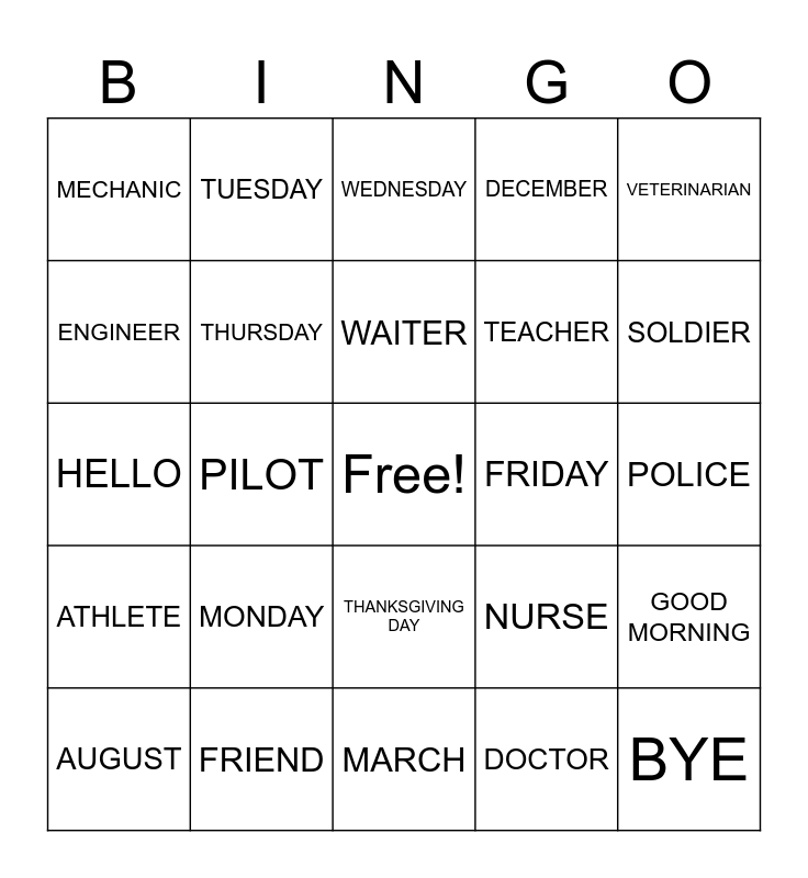 This bingo card has a free space and 24 words: MONDAY, FRIEND, WAITER, AUGUST, VETERINARIAN, MECHANIC, ENGINEER, TUESDAY, FRIDAY, THANKSGIVING DAY, TEACHER, HELLO, NURSE, GOOD MORNING, THURSDAY, DOCTOR, POLICE, WEDNESDAY, SOLDIER, PILOT, BYE, ATHLETE, DECEMBER and MARCH.