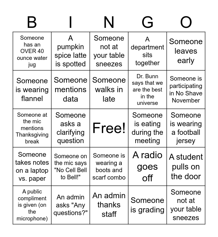 This bingo card has a free space and 24 words: Someone on the mic says "No Cell Bell to Bell!", An admin asks "Any questions?", Someone walks in late, A public compliment is given (on the microphone), Someone leaves early, Someone has an OVER 40 ounce water jug, Someone is wearing flannel, A pumpkin spice latte is spotted, Someone is eating during the meeting, Someone is wearing a boots and scarf combo, Dr. Bunn says that we are the best in the universe, Someone at the mic mentions Thanksgiving break, A radio goes off, A student pulls on the door, Someone mentions data, Someone is grading, Someone is wearing a football jersey, Someone not at your table sneezes, Someone is participating in No Shave November, Someone asks a clarifying question, Someone not at your table sneezes, Someone takes notes on a laptop vs. paper, A department sits together and An admin thanks staff.