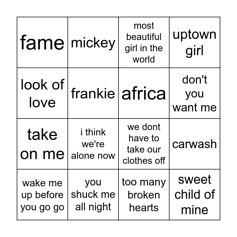 This bingo card has 42 words: heavan is a place on earth, don't you want me, never gonna give you up, i wanna dance with somebody, lets hear it for the boy, its raining men, wake me up before you go go, 1999, most beautiful girl in the world, freedom, too many broken hearts, i think we're alone now, carwash, look of love, pision arrow, red light spells danger, we didn't start the fire, we dont have to take our clothes off, jump around, mickey, frankie, true, i'm so excited, fame, time of my life, jump, take on me, every breath you take, girls just wanna have fun, total eclipse of the heart, don't you, sweet child of mine, africa, livin on a prayer, under pressure, down under, push it, you shuck me all night, just can't get enough, sweet dreams, uptown girl and all night ling.