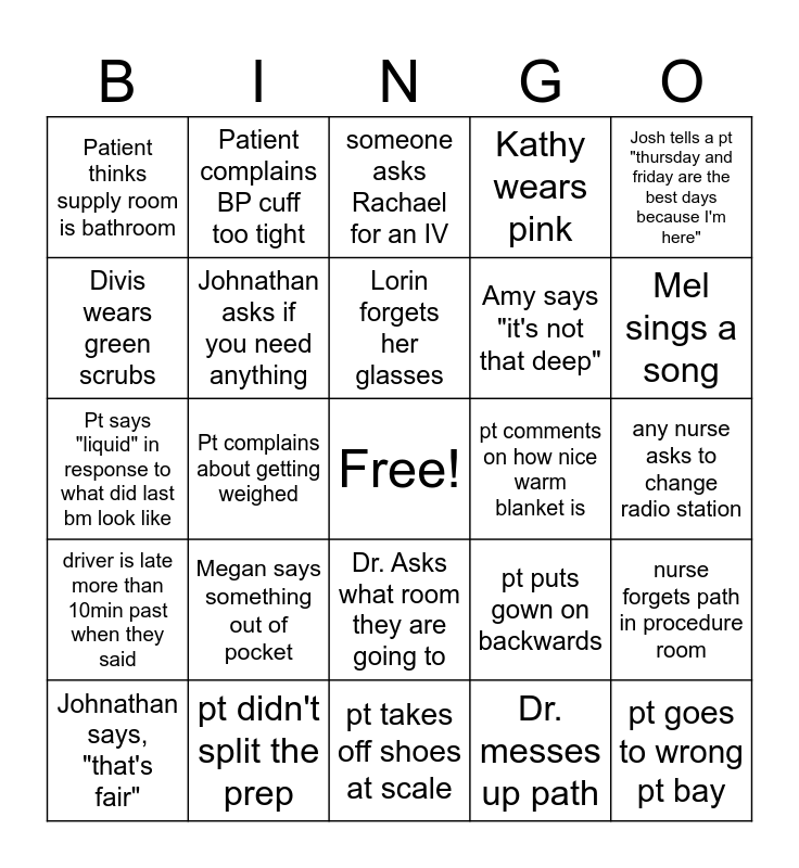 This bingo card has a free space and 24 words: Megan says something out of pocket, pt didn't split the prep, Lorin forgets her glasses, Johnathan says, "that's fair", Josh tells a pt "thursday and friday are the best days because I'm here", Patient thinks supply room is bathroom, Divis wears green scrubs, Patient complains BP cuff too tight, pt comments on how nice warm blanket is, Dr. Asks what room they are going to, Amy says "it's not that deep", Pt says "liquid" in response to what did last bm look like, pt puts gown on backwards, nurse forgets path in procedure room, Johnathan asks if you need anything, Dr. messes up path, any nurse asks to change radio station, someone asks Rachael for an IV, Mel sings a song, Pt complains about getting weighed, pt goes to wrong pt bay, driver is late more than 10min past when they said, Kathy wears pink and pt takes off shoes at scale.