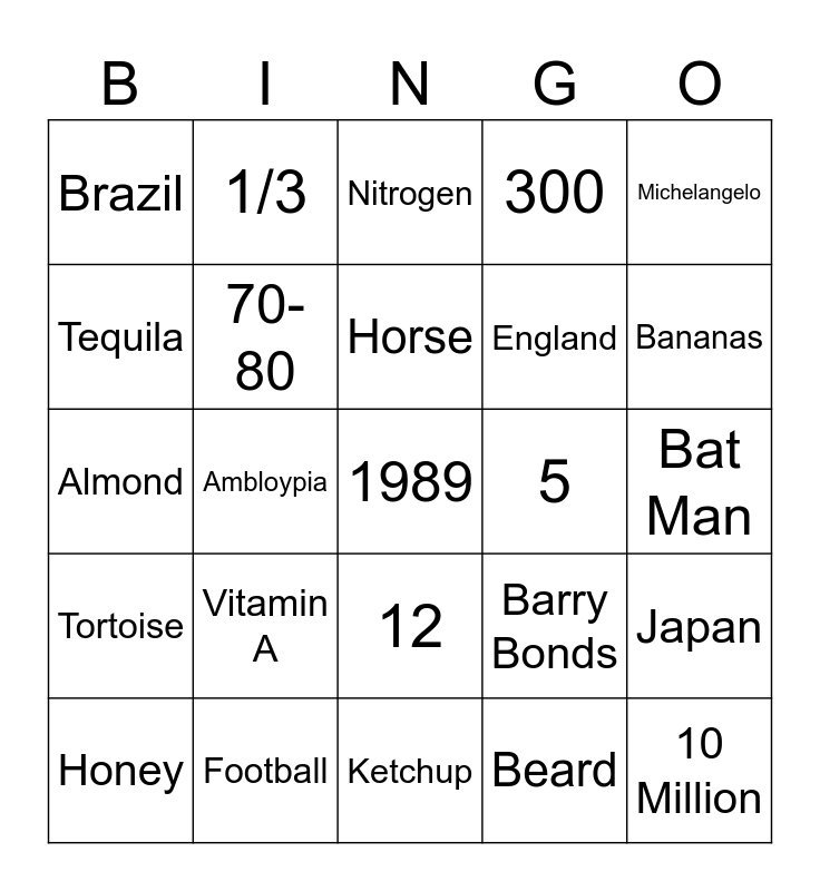 This bingo card has a free space and 24 words: Honey, Vitamin A, Horse, Beard, Michelangelo, Brazil, 1/3, Nitrogen, 5, Bat Man, Almond, 70-80, Barry Bonds, Japan, Tequila, Football, Ketchup, 300, Bananas, Tortoise, Ambloypia, 12, England and 10 Million.