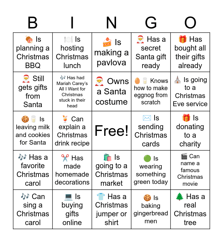 This bingo card has a free space and 43 words: π Has already put up their Christmas tree, π² Has a real Christmas tree, π Has a fake Christmas tree, πΆ Can sing a Christmas carol, π¬ Has a favorite Christmas movie, πͺ Is baking gingerbread men, π° Is making a pavlova, π Is wrapping gifts early, π Has bought all their gifts already, π» Is buying gifts online, π Has a secret Santa gift ready, βοΈ Is sending Christmas cards, ποΈ Is going to a Christmas market, βοΈ Has made homemade decorations, π€ Is going to a Christmas in the park, π Has a Christmas jumper or shirt, β¨ Is doing a Christmas lights tour, πͺπ₯ Is leaving milk and cookies for Santa, π Is watching the Christmas parade, βͺ Is going to a Christmas Eve service, π½οΈ Is hosting Christmas lunch, π³ Is trying a new recipe for Christmas, π₯ Is making a summer salad, π Is planning a Christmas BBQ, β€οΈ Is volunteering this Christmas, π Is donating to a charity, π΅ Has a holiday playlist ready, π΄ Is wearing something red today, π’ Is wearing something green today, πΆ Has a favorite Christmas carol, π° Is making a pavlova, π¬ Can name a famous Christmas movie, πͺ Is making Christmas cookies, πΉ Can explain a Christmas drink recipe, π² Can name a Christmas game, π Can tell a Christmas joke, π Has a unique Christmas tradition, π Owns a Santa costume, π Still gets gifts from Santa, π₯π₯ Knows how to make eggnog from scratch, π€ Loves Michael BublΓ© Christmas album, πΆ Has had Mariah Careyβs All I Want for Christmas stuck in their head and π¬ Has watched Love Actually more than 5 times.
