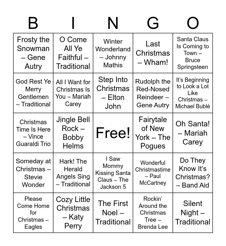 This bingo card has a free space and 50 words: White Christmas – Bing Crosby, Silent Night – Traditional, O Holy Night – Traditional, The First Noel – Traditional, Hark! The Herald Angels Sing – Traditional, Joy to the World – Traditional, O Come All Ye Faithful – Traditional, Deck the Halls – Traditional, God Rest Ye Merry Gentlemen – Traditional, Away in a Manger – Traditional, All I Want for Christmas Is You – Mariah Carey, Last Christmas – Wham!, Do They Know It’s Christmas? – Band Aid, Wonderful Christmastime – Paul McCartney, Happy Xmas (War Is Over) – John Lennon, Christmas (Baby Please Come Home) – Darlene Love, Step Into Christmas – Elton John, Fairytale of New York – The Pogues, Driving Home for Christmas – Chris Rea, Santa Claus Is Coming to Town – Bruce Springsteen, Jingle Bell Rock – Bobby Helms, Rockin’ Around the Christmas Tree – Brenda Lee, Frosty the Snowman – Gene Autry, Rudolph the Red-Nosed Reindeer – Gene Autry, Let It Snow! Let It Snow! Let It Snow! – Dean Martin, Sleigh Ride – The Ronettes, It’s Beginning to Look a Lot Like Christmas – Michael Bublé, Holly Jolly Christmas – Burl Ives, Winter Wonderland – Johnny Mathis, I Saw Mommy Kissing Santa Claus – The Jackson 5, Underneath the Tree – Kelly Clarkson, Mistletoe – Justin Bieber, Santa Tell Me – Ariana Grande, One More Sleep – Leona Lewis, Cozy Little Christmas – Katy Perry, Christmas Lights – Coldplay, My Only Wish (This Year) – Britney Spears, Shake Up Christmas – Train, Like It’s Christmas – Jonas Brothers, Oh Santa! – Mariah Carey, Blue Christmas – Elvis Presley, Pretty Paper – Willie Nelson, Hard Candy Christmas – Dolly Parton, Merry Christmas Baby – Otis Redding, Please Come Home for Christmas – Eagles, Christmas Time Is Here – Vince Guaraldi Trio, This Christmas – Donny Hathaway, What Christmas Means to Me – Stevie Wonder, Someday at Christmas – Stevie Wonder and The Christmas Song (Chestnuts Roasting on an Open Fire) – Nat King Cole.