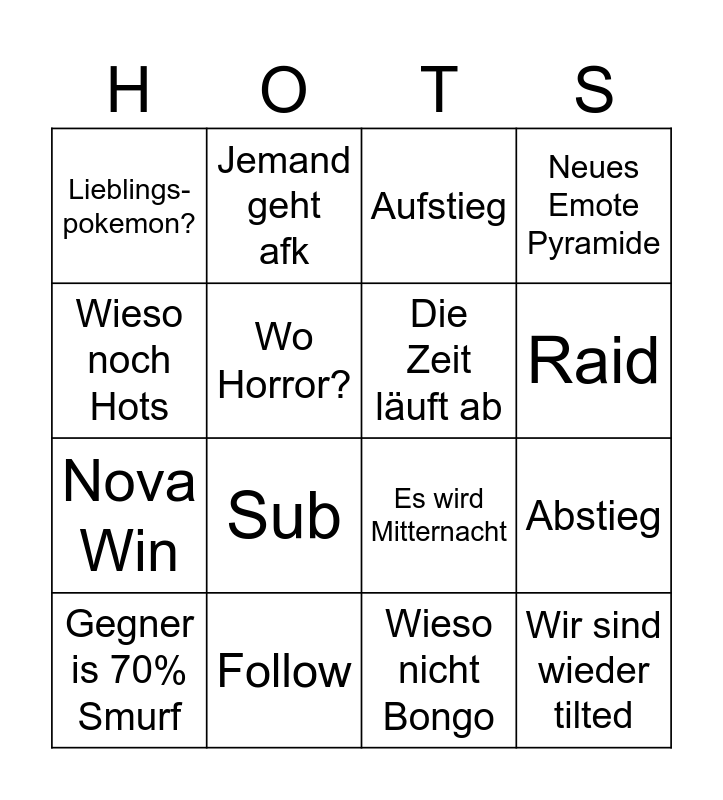 This bingo card has 16 words: Follow, Abstieg, Aufstieg, Lieblings-pokemon?, Nova Win, Jemand geht afk, Es wird Mitternacht, Wieso nicht Bongo, Wieso noch Hots, Wo Horror?, Gegner is 70% Smurf, Neues Emote Pyramide, Sub, Raid, Die Zeit läuft ab and Wir sind wieder tilted.