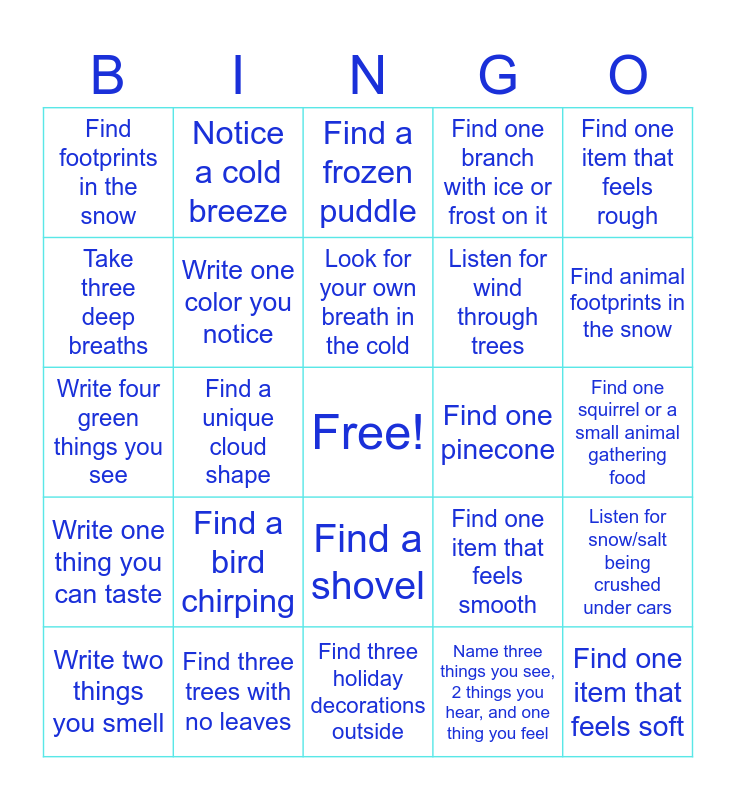 This bingo card has a free space and 24 words: Write two things you smell, Find a bird chirping, Look for your own breath in the cold, Name three things you see, 2 things you hear, and one thing you feel, Find one item that feels rough, Find footprints in the snow, Notice a cold breeze, Find a frozen puddle, Find one pinecone, Find one squirrel or a small animal gathering food, Write four green things you see, Write one color you notice, Find one item that feels smooth, Listen for snow/salt being crushed under cars, Take three deep breaths, Find three trees with no leaves, Find three holiday decorations outside, Find one branch with ice or frost on it, Find animal footprints in the snow, Write one thing you can taste, Find a unique cloud shape, Find a shovel, Listen for wind through trees and Find one item that feels soft.