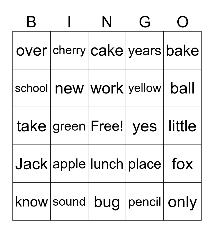 This bingo card has a free space and 24 words: apple, sound, work, know, bake, over, school, cherry, yes, lunch, yellow, take, place, fox, new, pencil, little, cake, ball, green, only, Jack, years and bug.