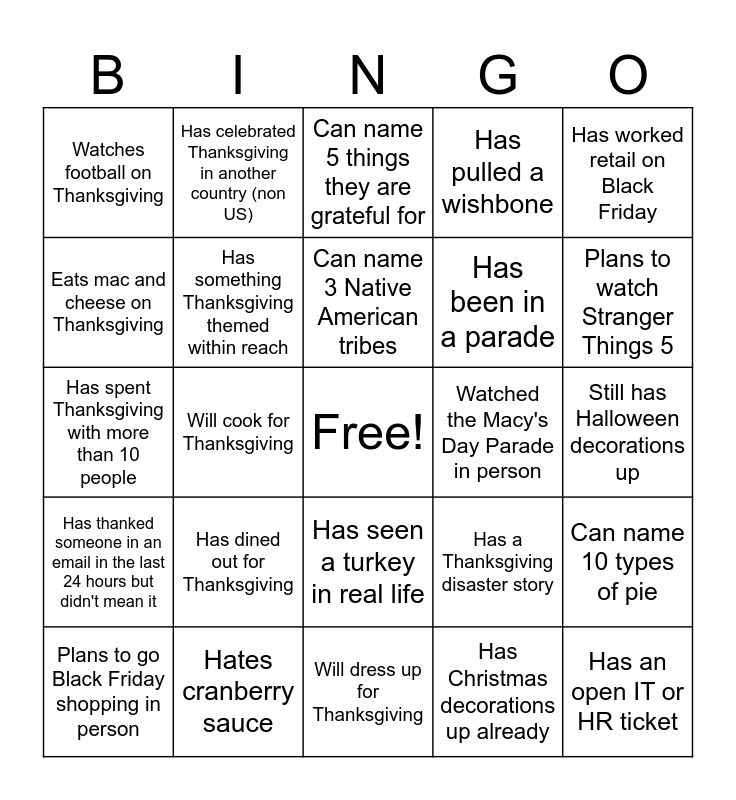 This bingo card has a free space and 24 words: Has dined out for Thanksgiving, Hates cranberry sauce, Can name 3 Native American tribes, Plans to go Black Friday shopping in person, Has worked retail on Black Friday, Watches football on Thanksgiving, Eats mac and cheese on Thanksgiving, Has celebrated Thanksgiving in another country (non US), Watched the Macy's Day Parade in person, Has seen a turkey in real life, Has been in a parade, Has spent Thanksgiving with more than 10 people, Has a Thanksgiving disaster story, Can name 10 types of pie, Has something Thanksgiving themed within reach, Has Christmas decorations up already, Still has Halloween decorations up, Can name 5 things they are grateful for, Plans to watch Stranger Things 5, Will cook for Thanksgiving, Has an open IT or HR ticket, Has thanked someone in an email in the last 24 hours but didn't mean it, Has pulled a wishbone and Will dress up for Thanksgiving.