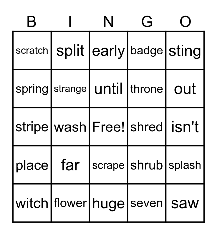 This bingo card has a free space and 24 words: far, flower, until, witch, sting, scratch, spring, split, shred, scrape, throne, stripe, shrub, splash, strange, seven, isn't, early, out, wash, saw, place, badge and huge.