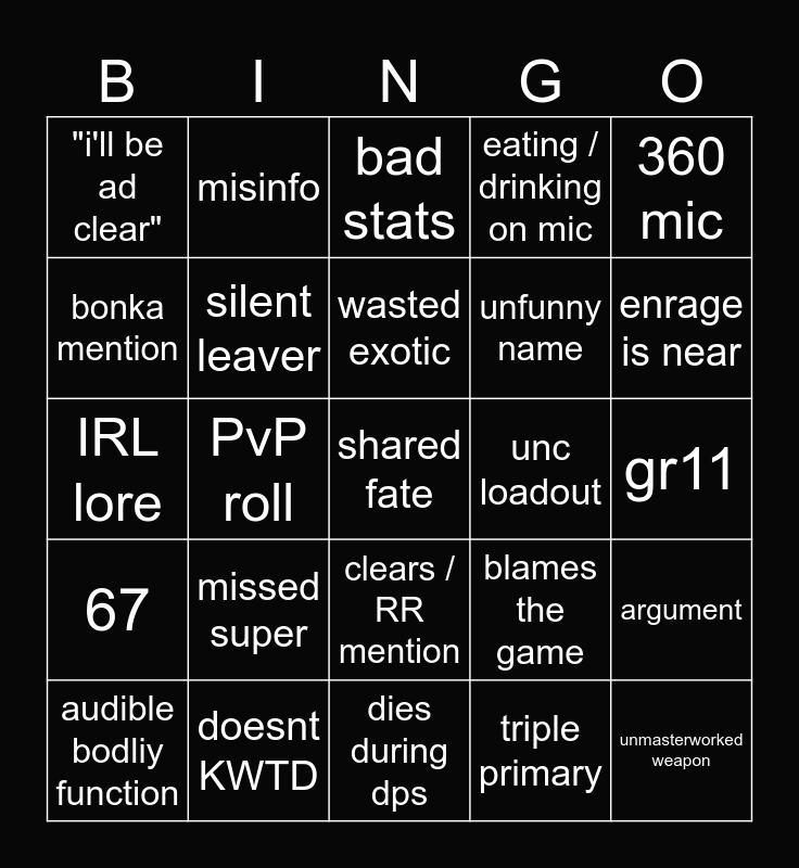 This bingo card has a free space and 24 words: audible bodliy function, missed super, wasted exotic, triple primary, 360 mic, "i'll be ad clear", misinfo, bad stats, unc loadout, gr11, IRL lore, silent leaver, blames the game, argument, bonka mention, doesnt KWTD, dies during dps, eating / drinking on mic, enrage is near, 67, PvP roll, clears / RR mention, unfunny name and unmasterworked weapon.