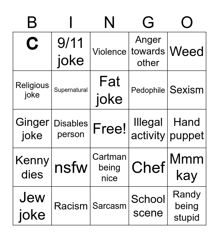 This bingo card has a free space and 24 words: Jew joke, nsfw, Fat joke, School scene, Weed, C, 9/11 joke, Violence, Illegal activity, Hand puppet, Ginger joke, Supernatural, Chef, Mmm kay, Religious joke, Racism, Sarcasm, Anger towards other, Sexism, Kenny dies, Disables person, Cartman being nice, Pedophile and Randy being stupid.