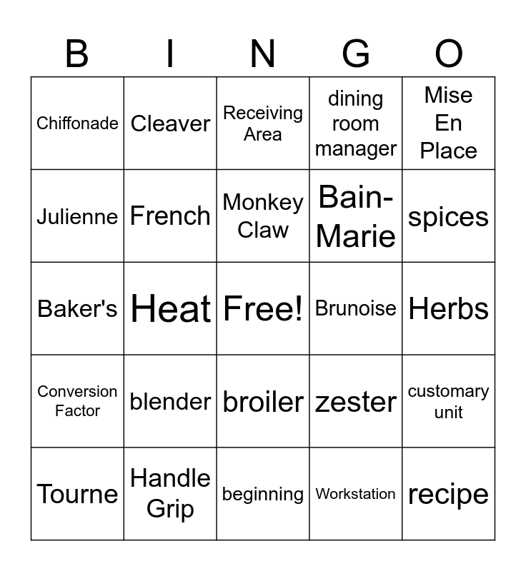 This bingo card has a free space and 24 words: blender, Handle Grip, Monkey Claw, Tourne, Mise En Place, Chiffonade, Julienne, Cleaver, Brunoise, broiler, Bain-Marie, Baker's, zester, customary unit, French, Workstation, Herbs, Receiving Area, spices, Heat, recipe, Conversion Factor, dining room manager and beginning.