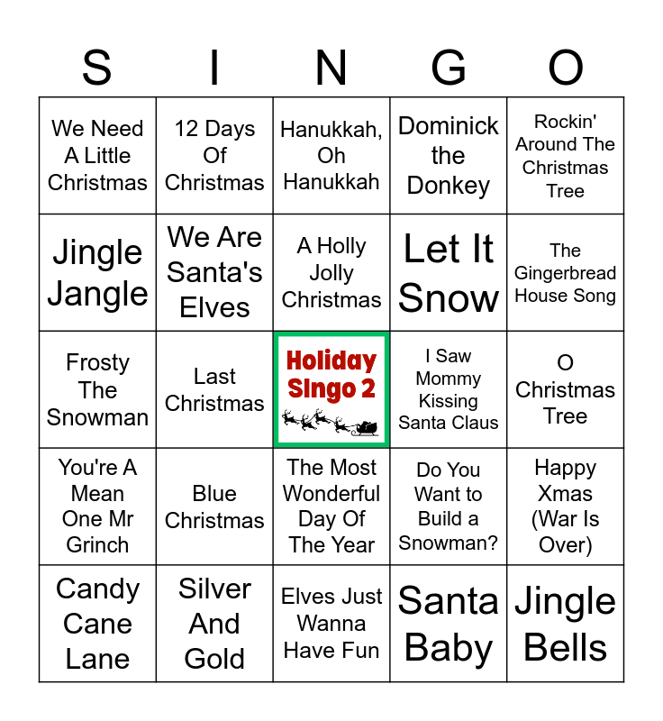 This bingo card has a free space and 40 words: Here Comes Santa Claus, Frosty The Snowman, Rudolph the Red-Nosed Reindeer, We Are Santa's Elves, Silver And Gold, The Most Wonderful Day Of The Year, A Holly Jolly Christmas, Jingle Bell Rock, Rockin' Around The Christmas Tree, You're A Mean One Mr Grinch, Last Christmas, Dominick the Donkey, Jingle Bells, O Christmas Tree, I Saw Mommy Kissing Santa Claus, Blue Christmas, Baby, It's Cold Outside, We Need A Little Christmas, Feliz Navidad, Hanukkah, Oh Hanukkah, Happy Xmas (War Is Over), Santa Baby, Let It Snow, Jingle Jangle, Run, Run, Rudolph, Up on the Rooftop, Dreidel Dreidel Dreidel, It's Beginning to Look a Lot like Christmas, Run Rudolph Run, Merry Christmas, Happy Holidays, Do You Hear What I Hear?, Candy Cane Lane, Grandma Got Run over by a Reindeer, Do You Want to Build a Snowman?, The Gingerbread House Song, Elves Just Wanna Have Fun, (Winter) Solstice Song, All I Want for Christmas Is You, 12 Days Of Christmas and Carol of the Bells.