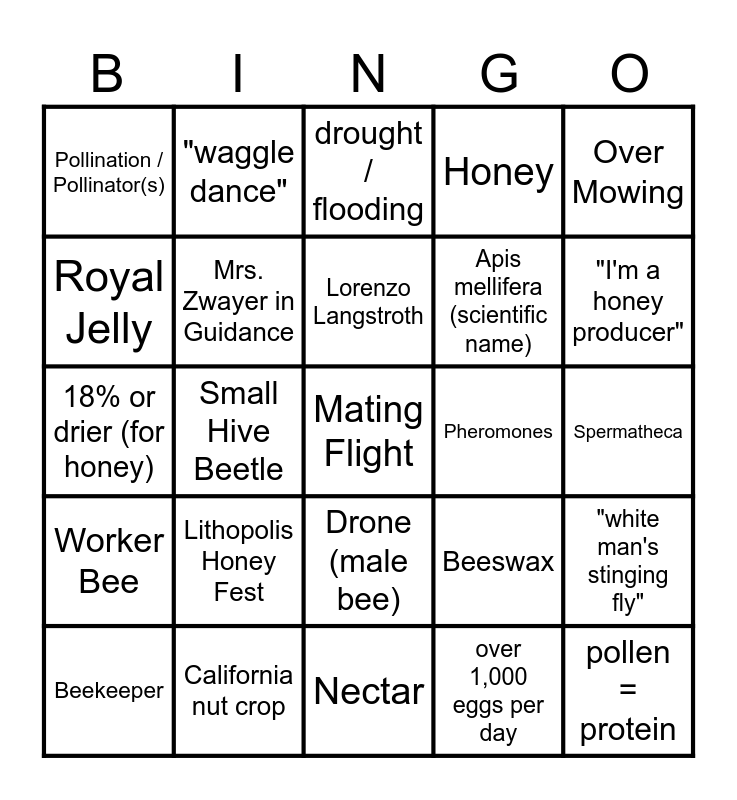 This bingo card has 39 words: Free!, FREE BEE, Varroa "Destructor" Mite, Mrs. Zwayer in Guidance, Beekeeper, Drone (male bee), Lorenzo Langstroth, Bee Swarm / Swarming, Over Mowing, Worker Bee, Small Hive Beetle, Honey, Mating Flight, Spermatheca, Pheromones, Lithopolis Honey Fest, Hive Tool, Pollination / Pollinator(s), Capping or Uncapping Honeycomb, Beeswax, Royal Jelly, Nectar, Apis mellifera (scientific name), "I'm a honey producer", Queen Bee, Bee-space (3/8 in), pollen = protein, wild / feral bees, Nurse bees, "waggle dance", bee-bread, climate change, drought / flooding, California nut crop, over 1,000 eggs per day, Regicide (queen murder), "white man's stinging fly", 18% or drier (for honey) and colony failure / collapse.