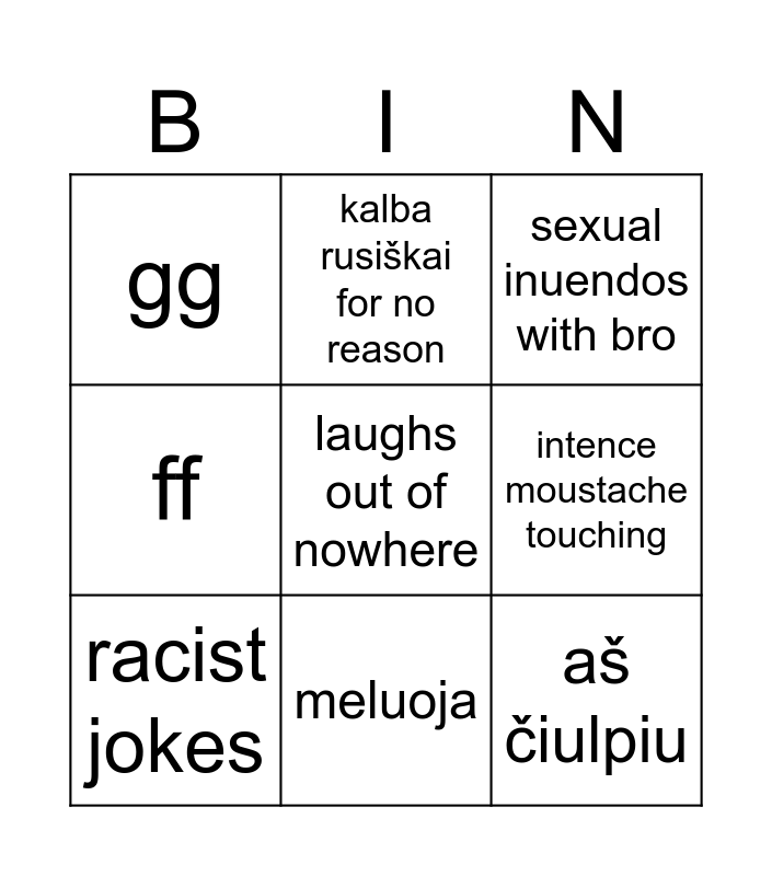 This bingo card has a free space and 8 words: intence moustache touching, sexual inuendos with bro, kalba rusiškai for no reason, racist jokes, gg, aš čiulpiu, ff and meluoja.