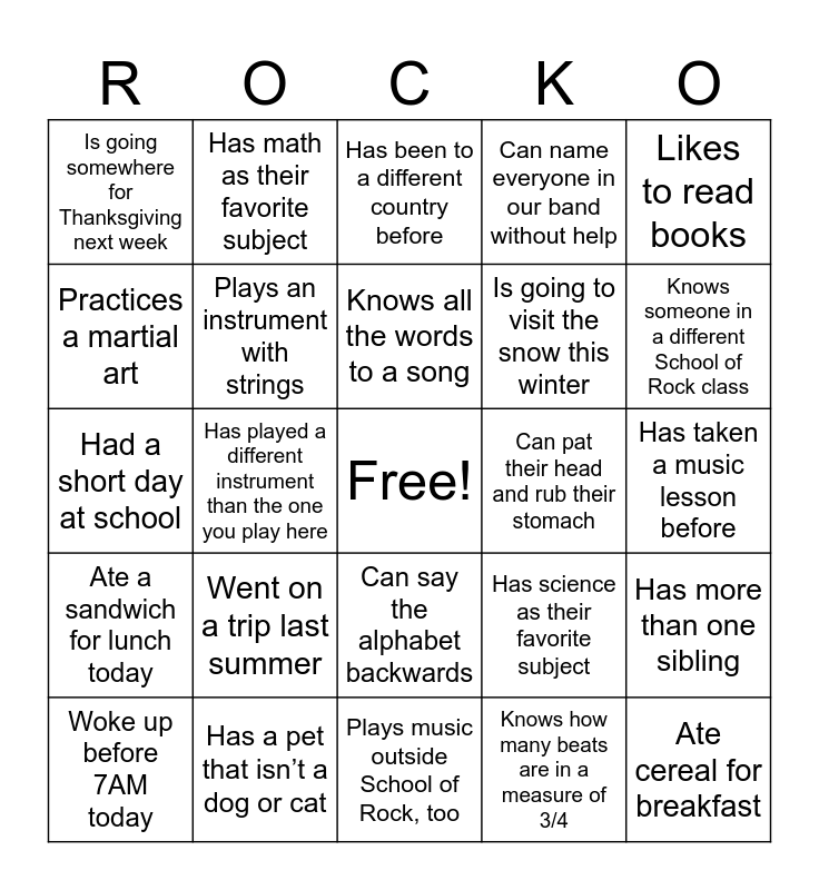 This bingo card has a free space and 28 words: Has more than one sibling, Don’t eat breakfast this morning, Is going to visit the snow this winter, Knows how many beats are in a measure of 3/4, Practices a martial art, Has been to a different country before, Has math as their favorite subject, Ate a sandwich for lunch today, Can pat their head and rub their stomach, Woke up before 7AM today, Had a short day at school, Can name everyone in our band without help, Has a pet that isn’t a dog or cat, Plays music outside School of Rock, too, Knows someone in a different School of Rock class, Plays a sport, Went on a trip last summer, Plays an instrument with strings, Knows all the words to a song, Can say the alphabet backwards, Is going somewhere for Thanksgiving next week, Has more than two siblings, Ate cereal for breakfast, Has played a different instrument than the one you play here, Has taken a music lesson before, Has science as their favorite subject, Likes to read books and Goes to music class at school.