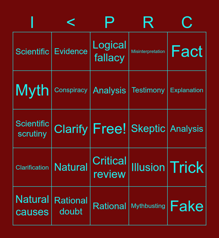 This bingo card has a free space and 51 words: Hoax, Fake, Explanation, Rational, Natural, Debunk, Evidence, Logical, Myth, Superstition, Conspiracy, Misinterpretation, Trick, Illusion, Video, Photo, Analysis, Skeptic, Investigation, Fact, Clarify, Mythbusting, Scientific, Testimony, Confirm, Disprove, Explanation, Rational thinking, Natural causes, Logical fallacy, Misleading, Pseudoscience, Distraction, Disproof, Evidence-based, Rational doubt, Critical thinking, Skeptical, Verify, Scientific method, Analysis, Clarification, Plausible, Evidence review, Logical reasoning, Rational debate, Scientific scrutiny, Myth busting, Rational analysis, Critical review and Evidence-based reasoning.