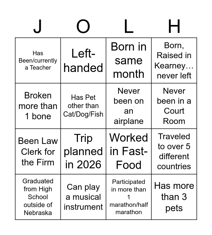 This bingo card has 32 words: Born outside of Nebraska, Never traveled outside of Continental US, Traveled to over 5 different countries, Has more than 5 Tattoos, Has more than 3 pets, Never been on an airplane, Broken more than 1 bone, Has Grandchild(ren), Left-handed, Never been on Roller-Coaster, Never been in a Court Room, Born in same month, Read more than 20 books in 2025, Volunteered for Organization in 2025, Can play a musical instrument, Gone Scuba Diving, Has checked something off Bucket List, Worked in Fast-Food, Worked in Retail at Christmas Time, Worked for same company/organization for over 20 years, Spent time in jail, Doesn’t like Chocolate, Participated in more than 1 marathon/half marathon, Won a Varsity Letter in High School, Graduated from High School outside of Nebraska, Born, Raised in Kearney…never left, Been Law Clerk for the Firm, Has Pet other than Cat/Dog/Fish, Has Been/currently a Teacher, 1st Jacobsen Orr Holiday Party, Traveled out of town for Concert in 2025 and Trip planned in 2026.